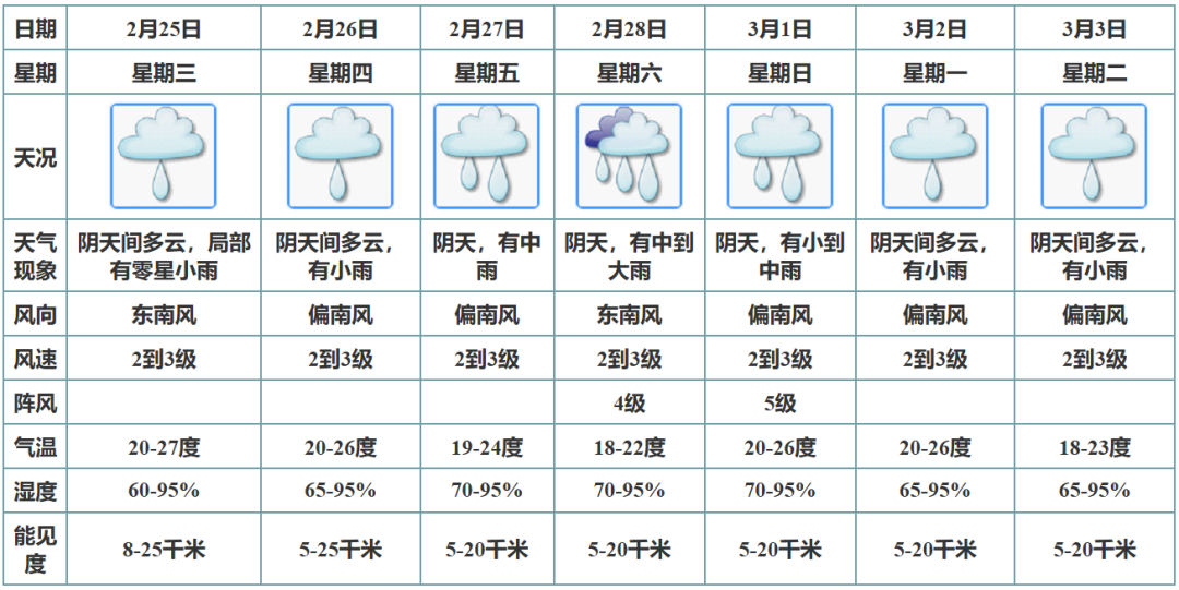 预计25日阴天间多云,局部有零星小雨和轻雾;26日阴天间多云,有小雨;27日-3月1日受高空槽和偏南气流共同影响,有一次明显降雨过程;3月2-3日阴天间多云,有小雨。未来一周雨雾增多,注意交通出行安全。